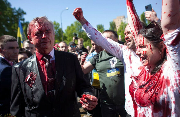 Russian ambassador to Poland hit with red paint by protesters